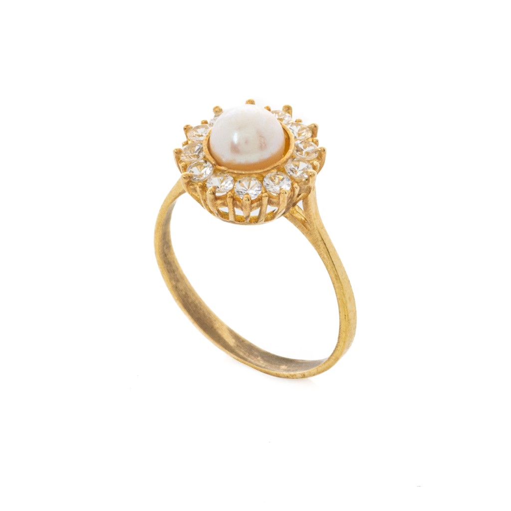 Elegant rosette ring in K14 yellow gold featuring a spherical, white, saltwater Akoya pearl 6mm and colorless bright stones