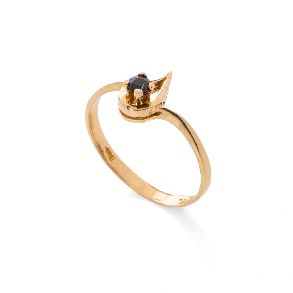 Elegant and unusual ring in K14 yellow gold with a round ruby. This design is also available with a dark blue sapphire