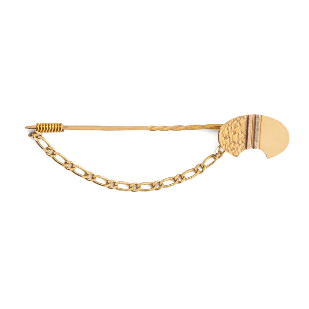 14K yellow gold lapel pin with a shiny and engraved matte-satin finish and white and rose gold detailing.
