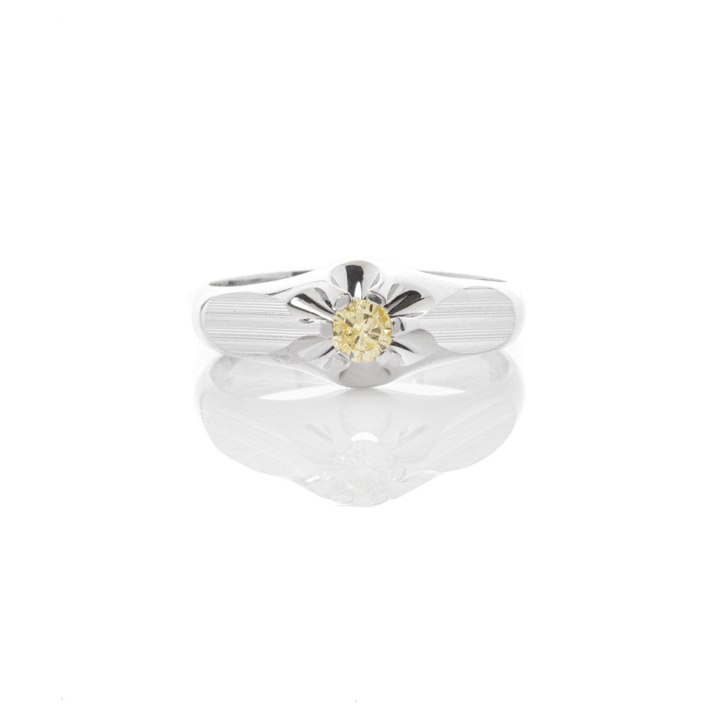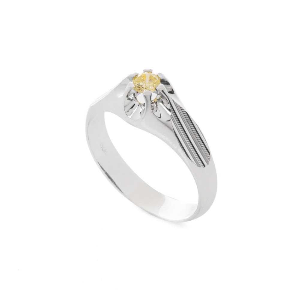 Beautiful ring made in 18K white gold with a shiny finish and a striped engraved design, featuring a 0.25ct round champagne diamond.