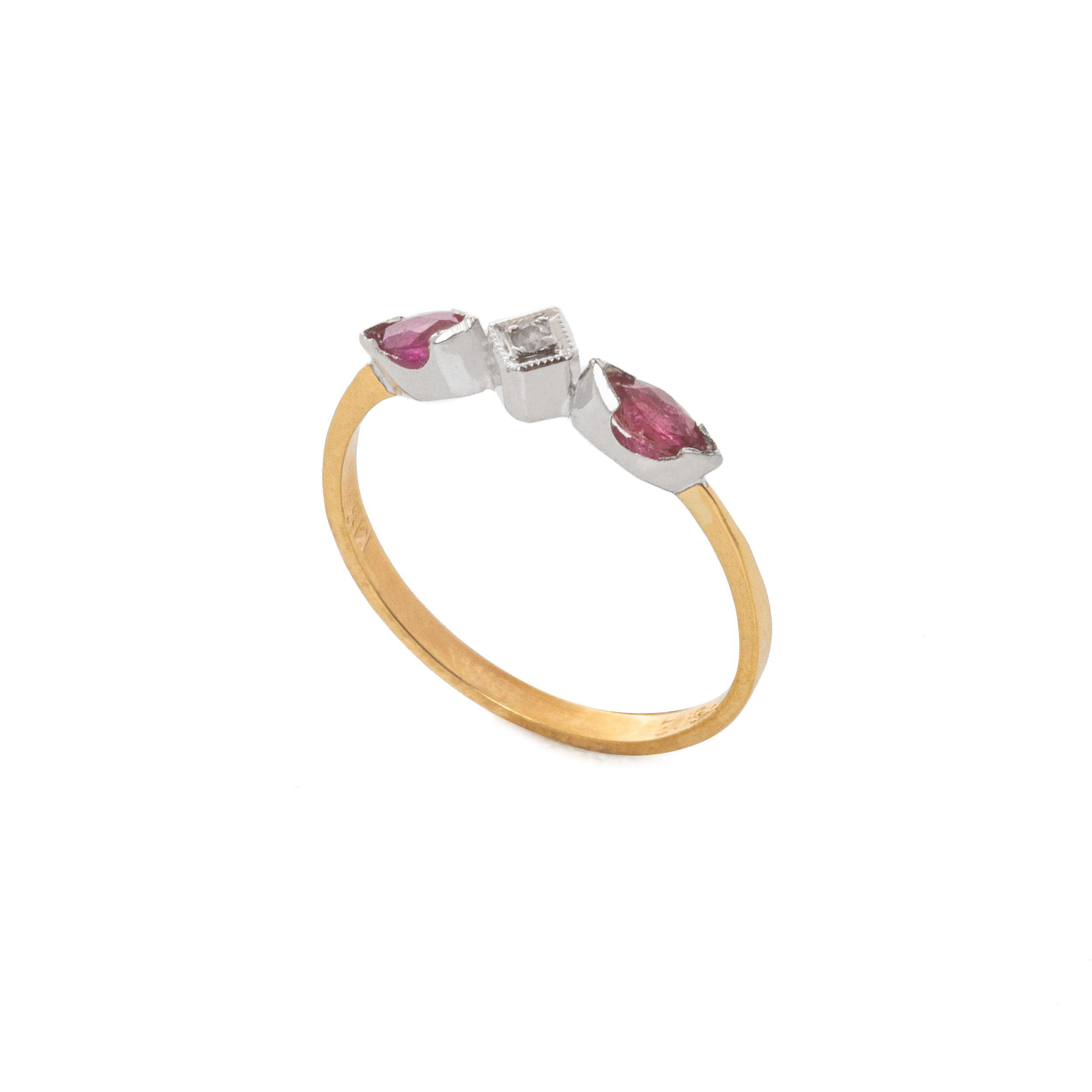 Elegant trilogy ring combining 18K yellow and white gold with two navette-cut rubies and a round huit-cut diamond.