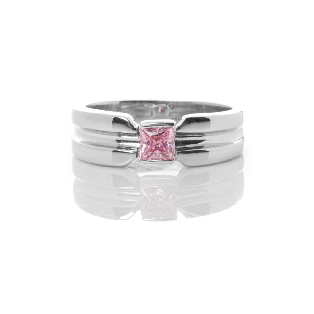 Modern ring in K14 white gold with shiny finish and a bright, square shaped pink stone