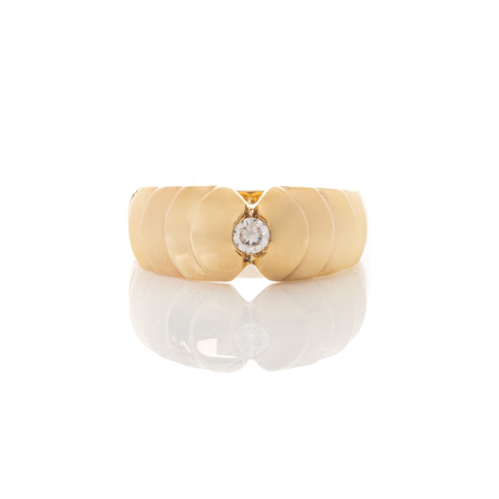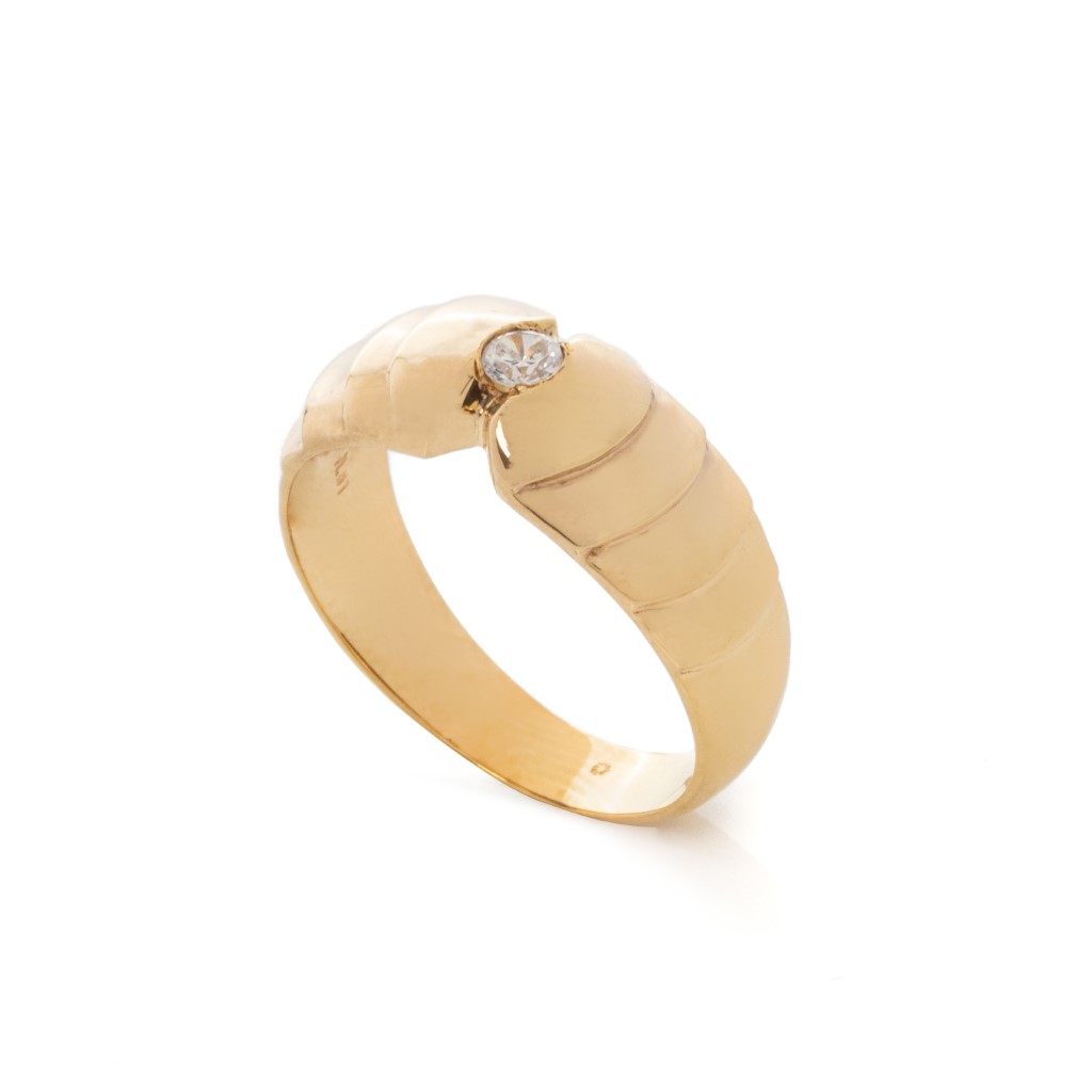 Unusual and eye-catching ring in 14K yellow gold with a shiny finish and a sparkling colorless stone.