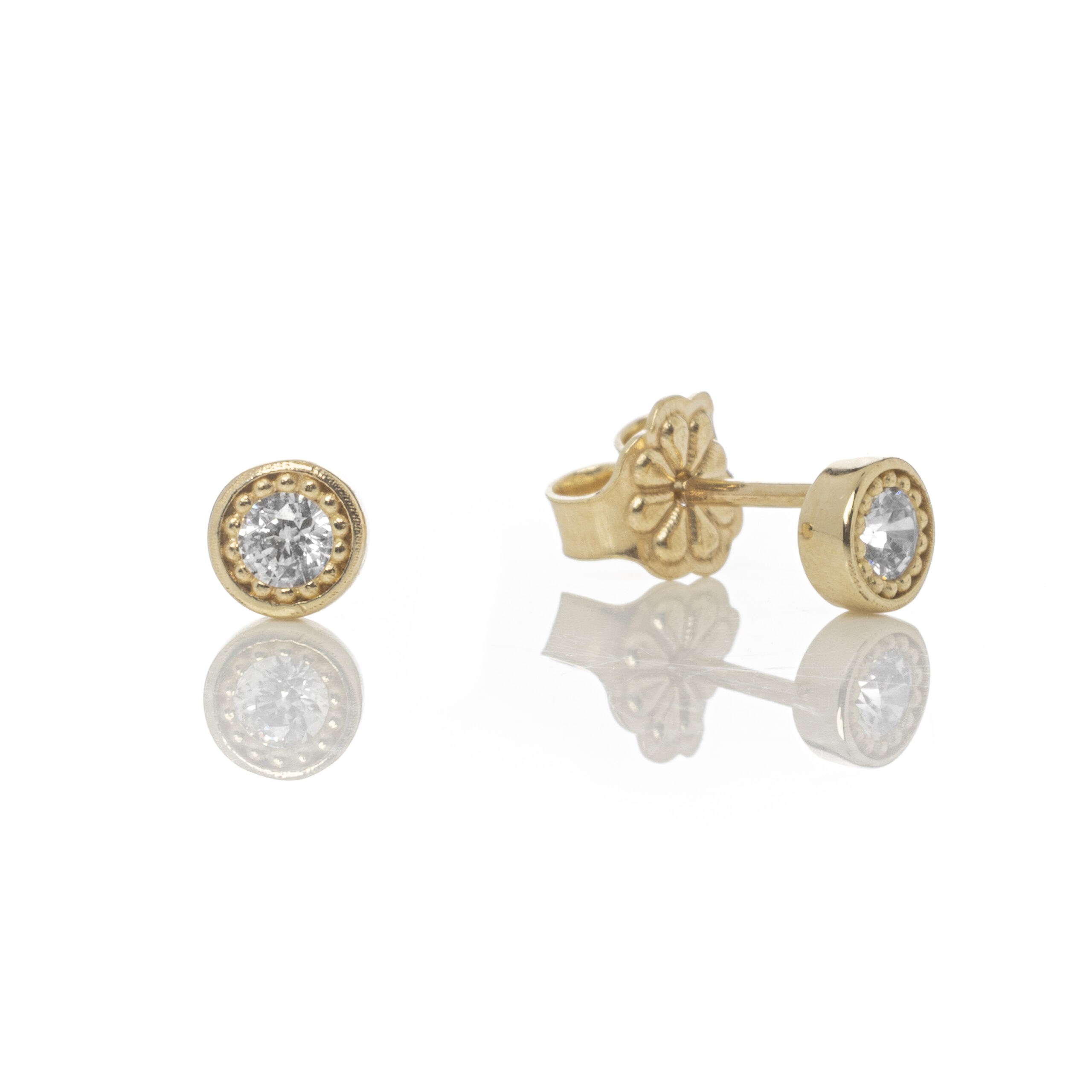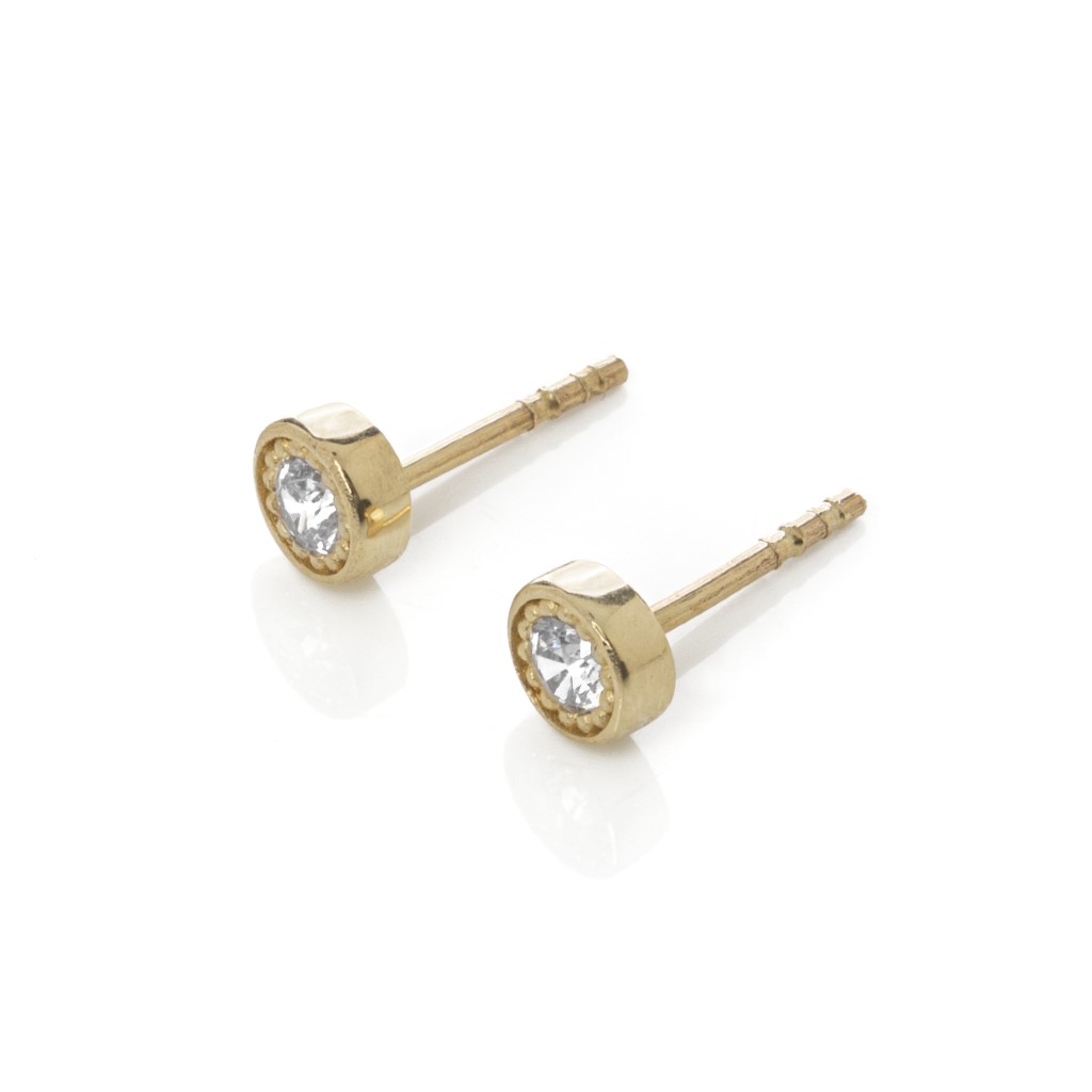 Όμορφα μονόπετρα σκουλαρίκια από κίτρινο χρυσό Κ14 με άχρωμες λαμπερές πέτρες.