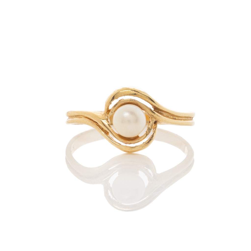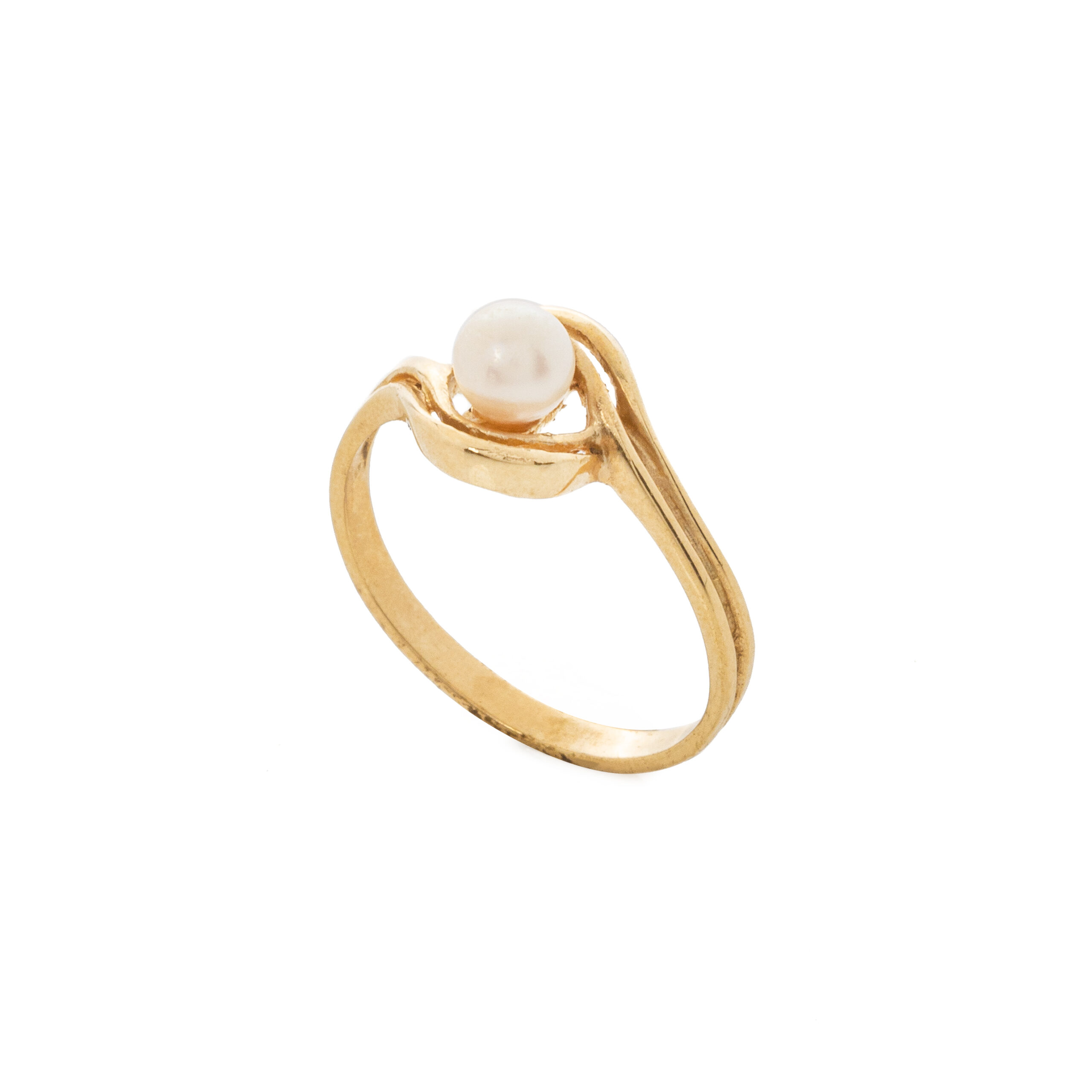Όμορφο δαχτυλίδι από κίτρινο χρυσό Κ14 με ένα σφαιρικό, λευκό θαλασσινό μαργαριτάρι Akoya 5mm και γυαλιστερό φινίρισμα