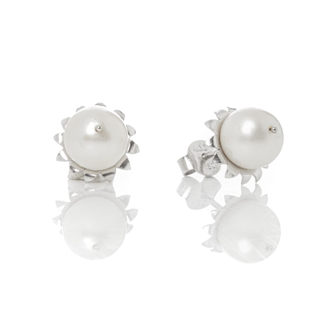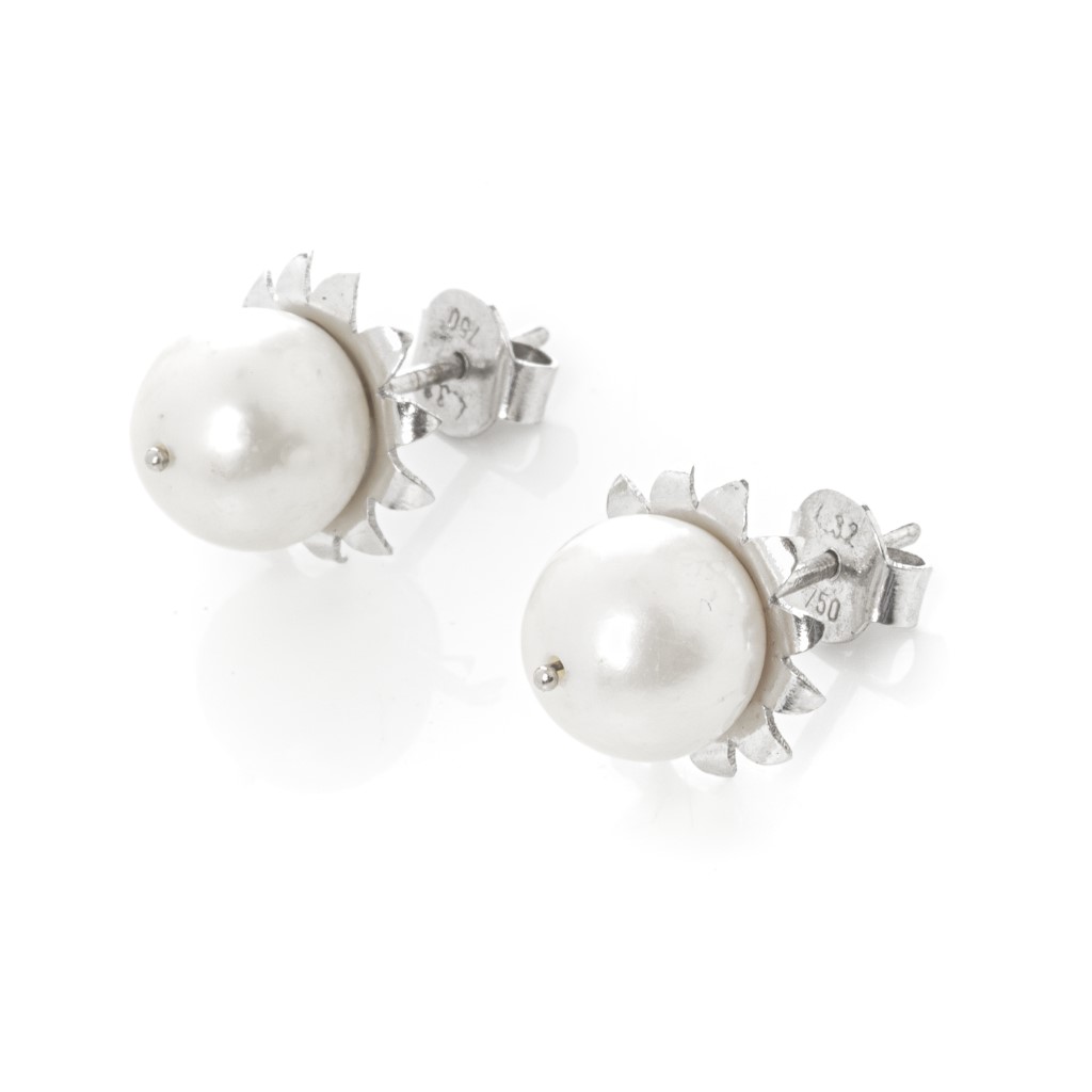 Ασυνήθιστα σκουλαρίκια από λευκό χρυσό Κ18 σε σχήμα λουλουδιού, με σφαιρικά λευκά μαργαριτάρια 9χιλ
